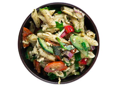 Pasta van TARWE, rucola, komkommer, cherrytomaten, zongedroogde tomaten, rode paprika, rode ui, Parmezaanse KAAS, PESTO